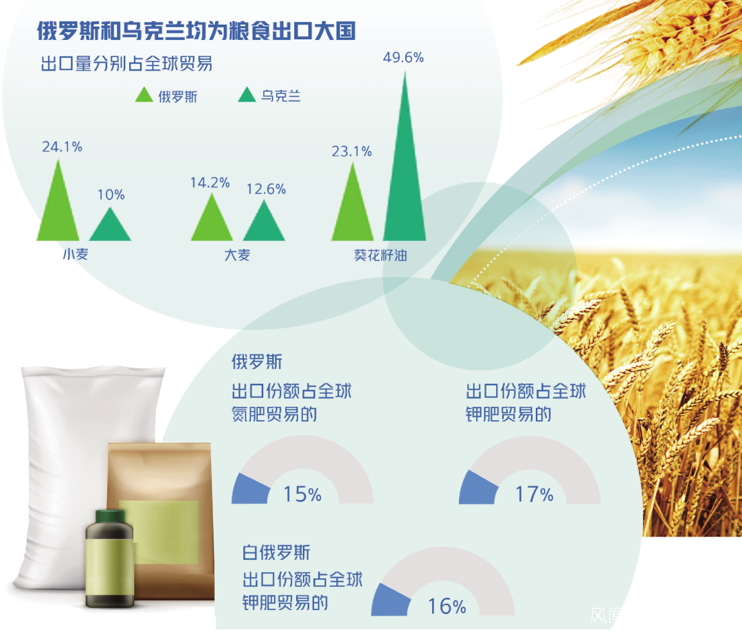 俄羅斯是世界糧食生產大國,也是全球最大的小麥出口國。而烏克蘭的黑土地面積佔全世界黑土地面積的23%。憑藉着肥沃的土地資源,烏克蘭成為全球農產品主要出口國之一,被譽為“歐洲的糧倉”。