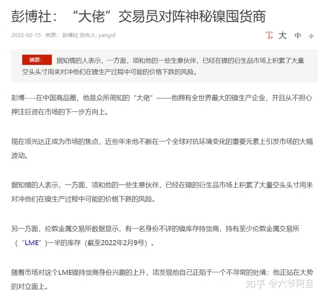 最早在2月9號,彭博社就發過文章,説倫鎳上有個大空頭,而且指名道姓,説的就是青山。下面這是國內過了幾天又翻譯過來的報道:
