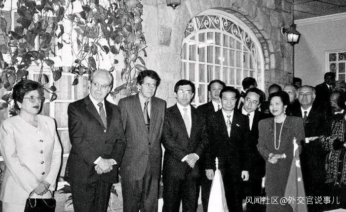 △ 1996年11月2日,陳大使為慶祝中秘建交25週年在使館舉行招待會,聯合國前秘書長德奎利亞爾(左2)出席慶祝。圖源:《走進神秘國度》