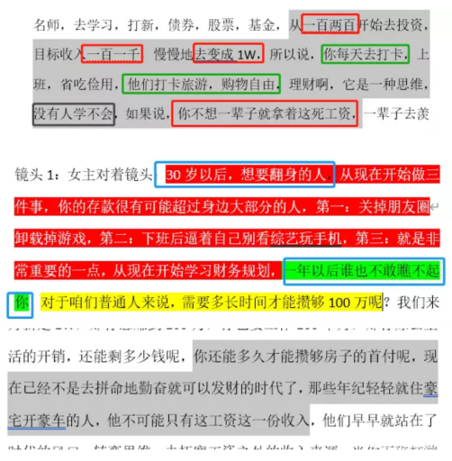 “我們負責視頻產出,工作就是腳本、拍攝和剪輯,有的文案客户會提供,有的就是我們自己寫。內容無非就是一些扎心的話以渲染焦慮。”小明告訴燃財經,其實市面上無論是理財課程還是教育培訓類課程,背後邏輯都一樣,就是按照模板將文案串聯起來,最後呈現結果大同小異。