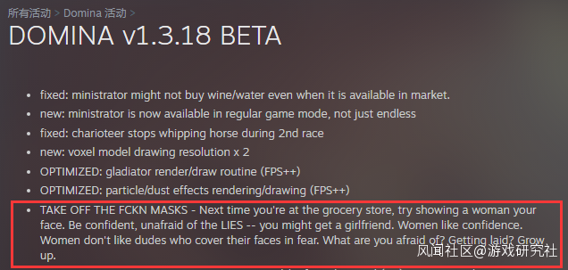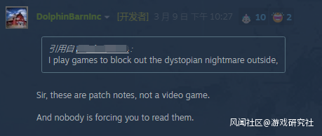拋開口罩謊言論這個事的是非不談,翻翻他們的更新日誌你就會發現,這位開發者有時候會把Steam更新日誌當成了自己的社交媒體賬號,把自己的論點寫進更新日誌,在他這或許真就跟回家吃飯一樣理所當然。