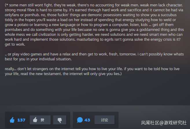 而更多純粹只想玩遊戲的人,只覺得莫名其妙,不知道開發者為啥要把這番爭議言論寫進來。
