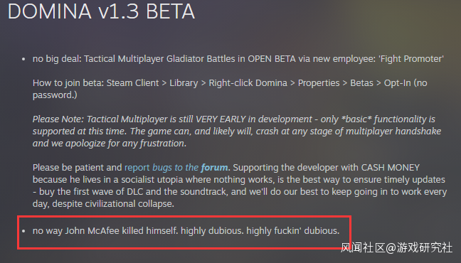 造成這種狀況的原因來自於開發者Dolphin Barn Incorporated最近的一次更新。3月8日,遊戲發佈了v1.3.18 BETA更新日誌,玩家們在Steam閲讀更新日誌的同時,發現了其中一句非常反常的話。