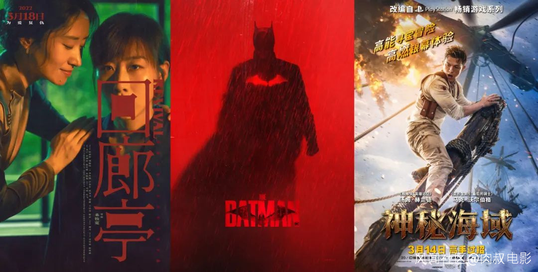 一部改編自東野圭吾原著的國產片《迴廊亭》,兩部海外引進大片:“暮光男”帕丁森擔綱的《新蝙蝠俠》,以及“小蜘蛛”荷蘭弟主演的《神秘海域》。