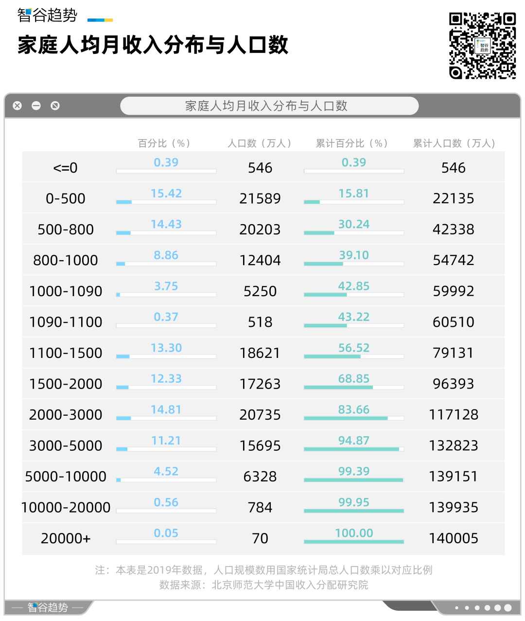 北京師範大學中國收入分配研究院曾針對中國人可支配收入做了一個抽樣,然後按比例放大到全國範圍,它可能不那麼精確,但讓人們理解我們所處的時代已經足夠。