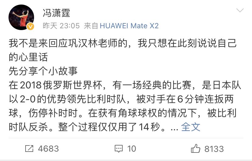 【本文來自《前國足隊長馮瀟霆疑似暗諷鞏漢林國足言論:退役了,讓給他》評論區,標題為小編添加】