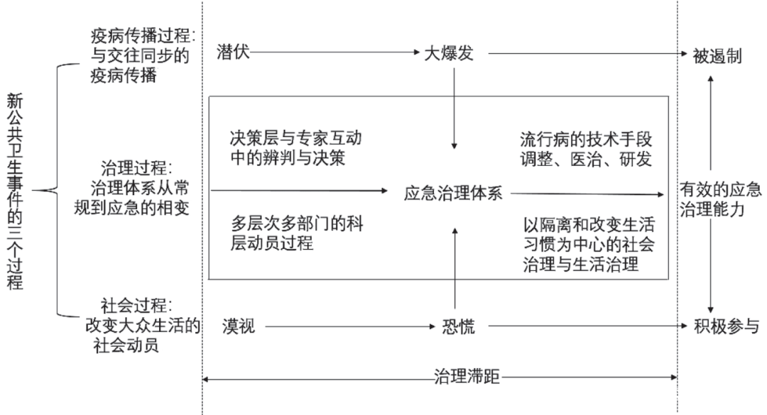 新公共衞生事件治理一般經歷三個過程:一是疫病傳播過程,從潛伏到爆發再到被遏制。疫情錯失早期預警、防控時機,就會迅速爆發,新發傳染病更為複雜與特殊,它會隨人口流動互動迅速擴散,從而使後期的防控產生諸多的治理能力要求。二是治理過程,因為新公共衞生事件極為特殊,需要融入疾控專家的專業知識判斷與治理主體的統籌考慮,相應地也從傳染病防控技術與科層動員兩個層面產生治理能力需求。最終的結果是常規治理體系實現了嚮應急治理體系的相變,使得應急治理體系確實具備了有效的應急治理能力。三是社會過程,亦即疫情防控的社會動員過程,人們對疫情的參與程度經歷了從漠視、恐慌到積極支持和參與再到社會動員過程的變化,這個過程中,因為疫情發展與社會動員的共同作用,人們不得不嘗試改變傳統的習俗與生活行為。從常規治理體系向具有預期的應急治理能力的應急治理體系的轉變,恰恰存在一個長短不定的時間差距,即“治理滯距”。