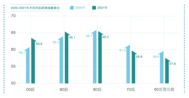 中國乳業也有類似的趨勢。中國乳製品工業協會發布的《2021中國奶商指數報告》數據顯示,以80、90後為主的中青年羣體奶商指數得分相對較高,均超過65分,其中,00後的奶商指數過去一年的增速迅猛,增長了3.7分。