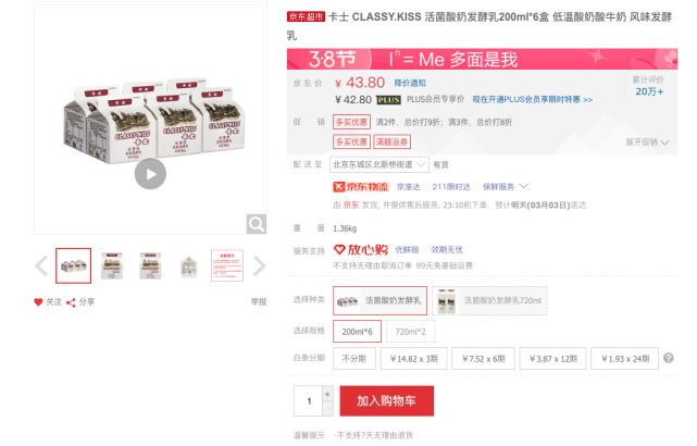 以定位都市女性的高端酸奶品牌卡士為例,其在傳統酸奶的基礎上,進行品味升級,向功能化、零食化方面進化。比如在京東平台, CLASSY.KISS 活菌酸奶發酵乳200ml*6盒售價就高達40元左右,月銷20萬+。