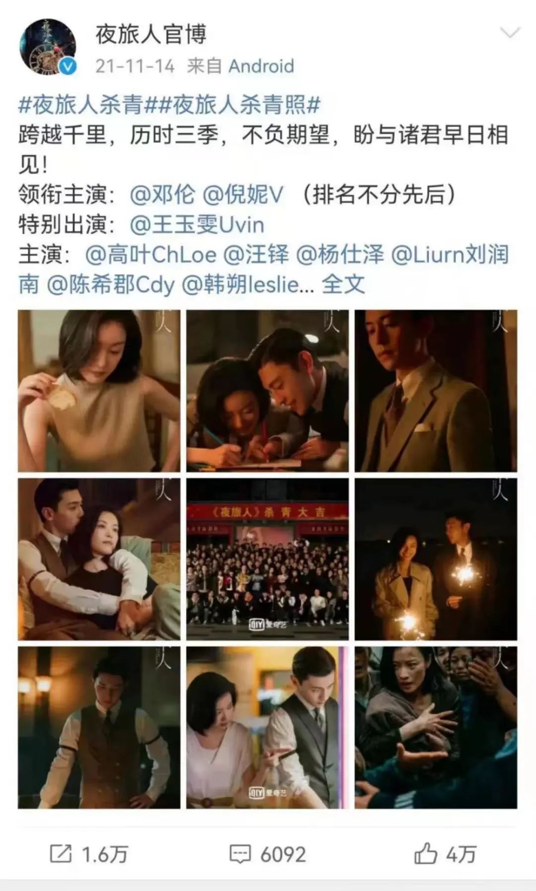 還有一堆待播的劇,比如去年殺青的劇集《夜旅人》,鄧倫和倪妮主演。據説這部劇投資過億,男主演出事,結合今年整個影視行業的“大行情”,可能導致播出無望了。