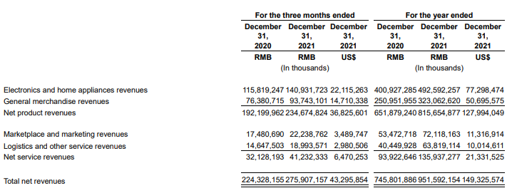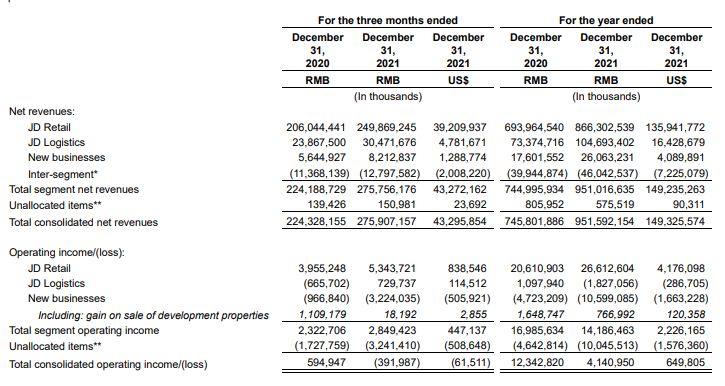 2021 年京東零售總收入為 8663 億元,同比增長 25%;其中四季度收入 2498 億元,同比增長 21%。低於全年增速。