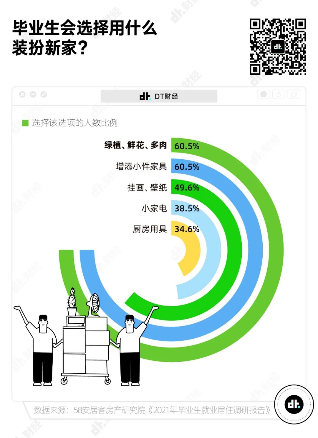 在裝扮新家時,“綠植、鮮花、多肉”也是年輕人的首選。《2021年畢業生就業居住調研報告》表明,在準備搬入新居時,年輕人選擇用“綠植、鮮花、多肉”裝扮新家的比例與選擇“增添小件傢俱”的比例比肩,甚至超過了購買小家電、廚房用具等實用的家居用品。