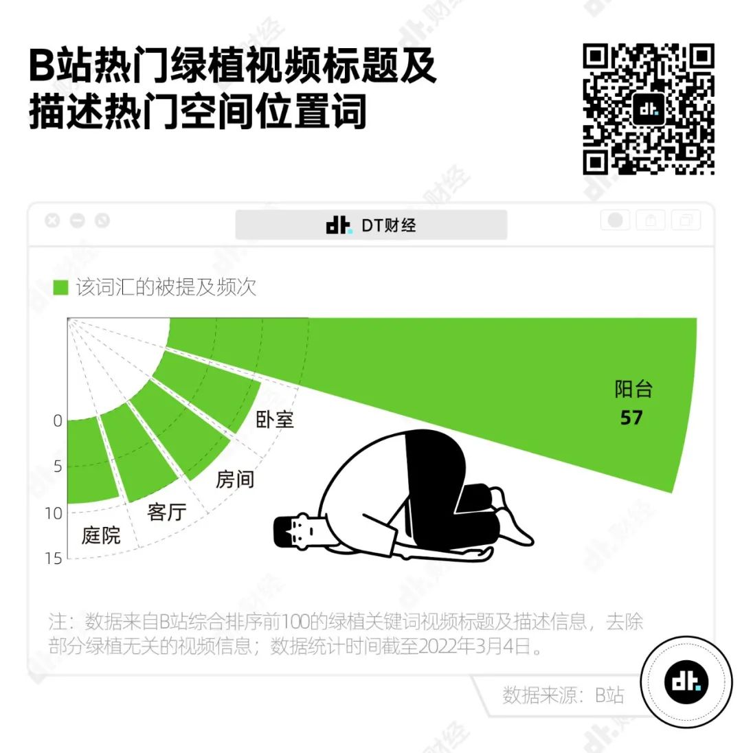 由於不少綠植都需要充足的陽光,所以陽台是大家放置綠植最常見的場所。從B站熱門綠植視頻來看,陽台是排名第1的空間位置詞。