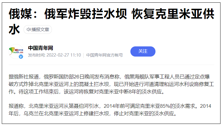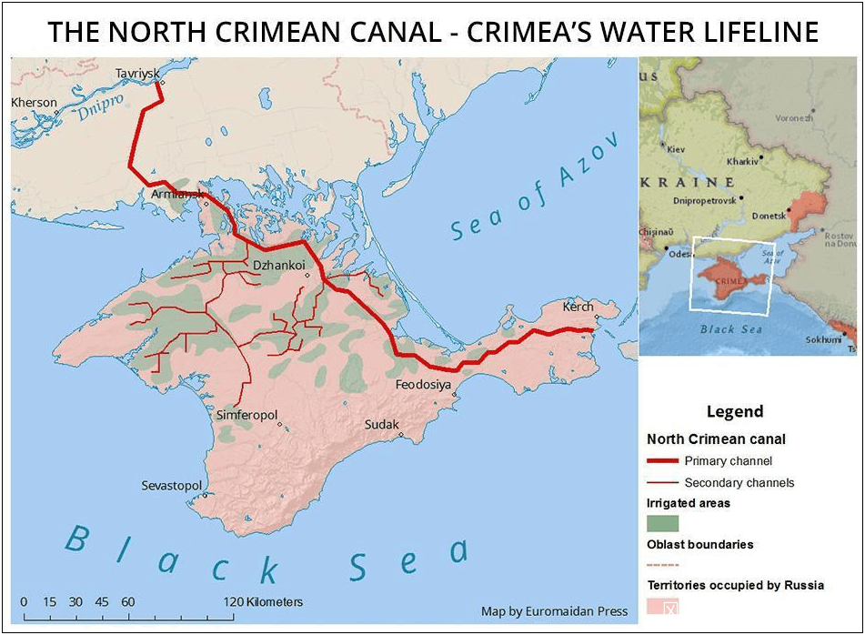 克里米亞是一個半島,85%的淡水需要從第聶伯河引水,而在2014年俄羅斯吞併了克里米亞以後,烏克蘭就在運河上修建了攔水壩,停止了對克里米亞的供水。