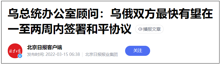 於是,我們就看到一則信息:3月14日,烏克蘭總統辦公室顧問阿列斯托維奇表示,烏克蘭與俄羅****斯雙方最快有望在一至兩週內簽署和平協議,最遲將在5月簽署和平協議。