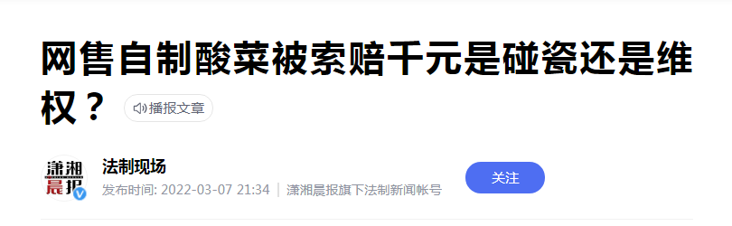 而這件事也再次引起了一些網友關於農民自制酸菜是不是初級農產品的爭論。起因是3月5日有位75歲的貴州老人在網上售賣自制的酸菜被買家投訴三無產品並索賠1000元,老人得知後難過流淚。