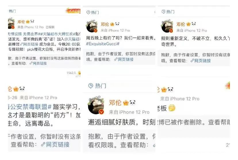 從鄧倫個人微博來看,此前轉發品牌方的商務微博,原微博幾乎都已被刪除或者設置權限,顯然此前有過合作的各個品牌方都在快速自查,及時割席。