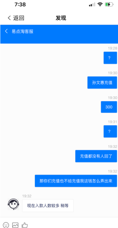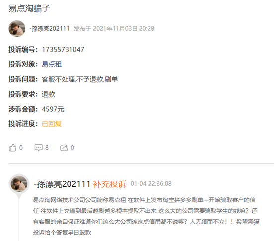有消費者稱, 易點租在軟件上發佈淘寶拼多多刷單一開始騙取客户的信任,往軟件上充值到最後越刷越多根本提取不出來,這麼大的公司需要騙取學生的錢嘛?還有客服的親自保證難道你們這麼大公司連這點信用都不説嘛?