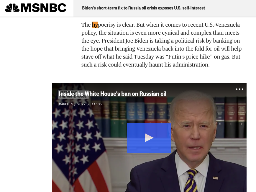 冒着巨大的政治風險,拜登政府寄希望於讓委內瑞拉重新參與石油交易,來避免油價上漲給美國造成負擔。連MSNBC的專欄文章都直指,這一步走得實在太虛偽了。
