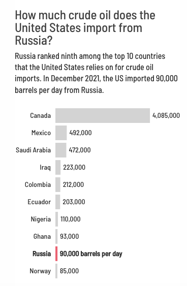 小王身邊也有不少朋友開始考慮選擇公共交通去上班了。油價的猛增,是實實在在提升了美國人的生活成本。但實際上,俄羅斯並非美國石油進口來源主要國家,原油加精煉油產品佔到美國石油進口的8%。