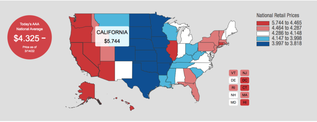 而在全美,西部州的油價是整體最貴的,加州已經飆到5.7美元了,深藍色的中部州是最便宜的。