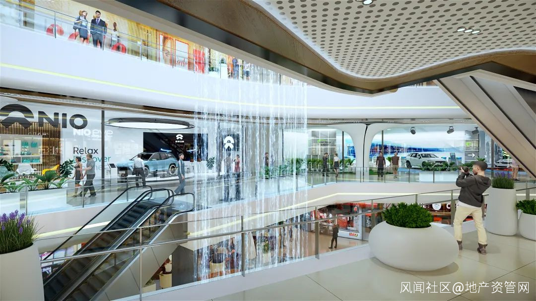 商場入口(左上)藝術雕塑“予你新世界” (右上)商業主中庭(左下)真水幕簾(右下)