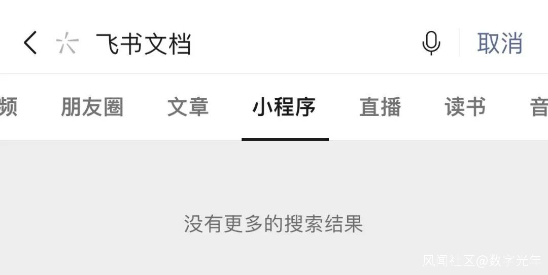 經驗證,目前,在微信上搜索“飛書文檔”小程序,仍顯示“沒有更多搜索結果”。