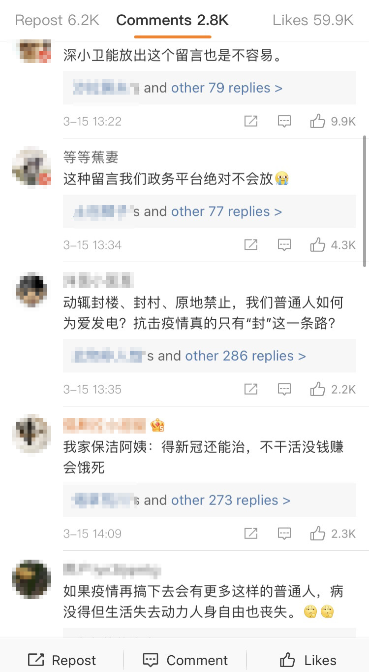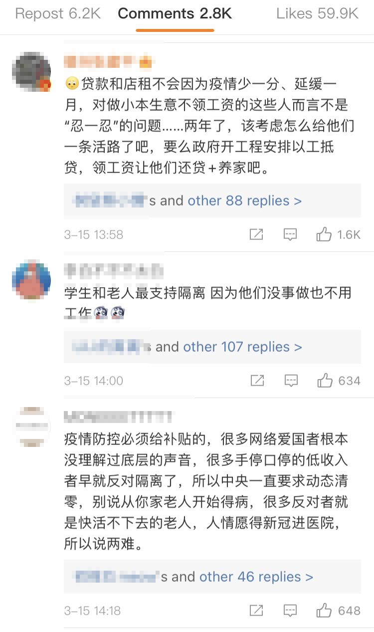 看了下網友們的評論,有人説“如果疫情再搞下去會有更多這樣的普通人,病沒得但生活失去動力人身自由也喪失”。