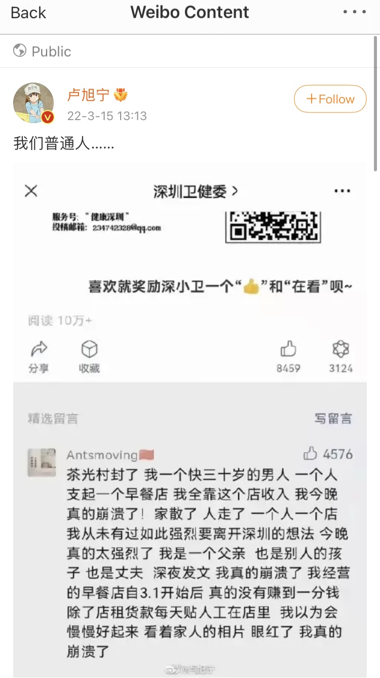 賴林遠説,上個月還掙了一點錢,但進入3月份,情況就非常嚴峻了,特別是近日所住的茶光村被列“封控區”,情緒更是受影響。剛好看到深圳衞健委凌晨的推文,就在留言中表達了自己的感慨。