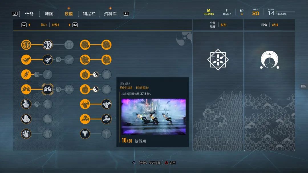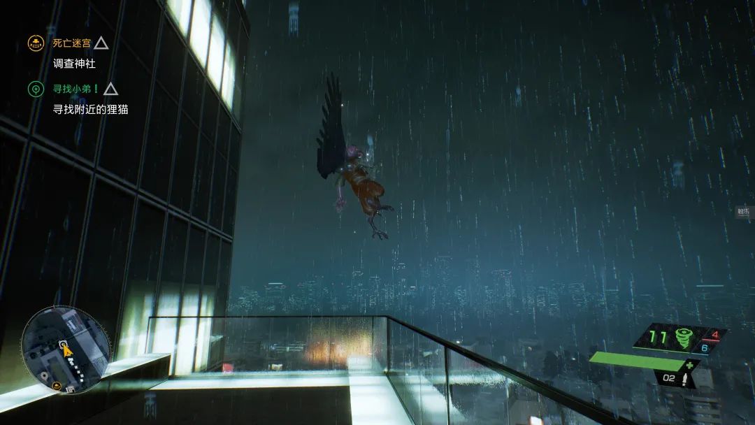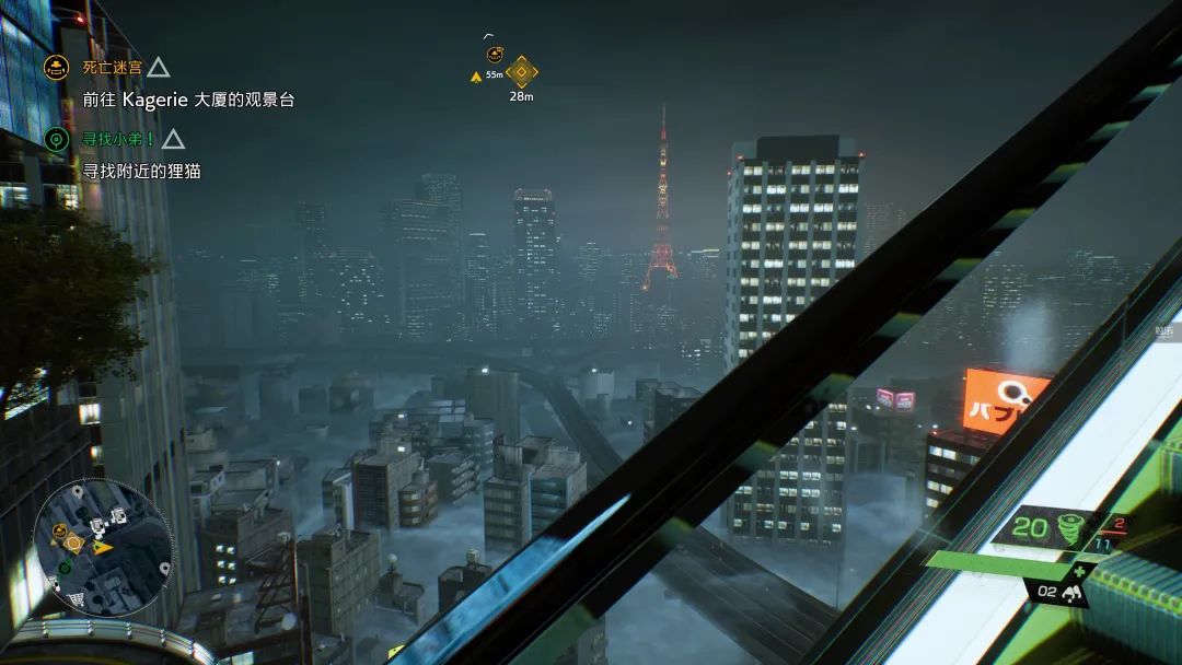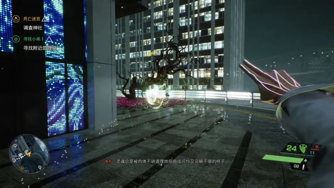 又如,主人公可以通過天空中飛翔的天狗傳送到高處,此時玩家會發現遊戲中東京鱗次櫛比的高樓頂端分佈着大量靈體。在技能樹裏,玩家可以用點數解鎖更好的飛翔技能和更長的滯空時間,“飛來飛去”的行動不僅有助於玩家提升更多經驗,還拓展了玩家的思路。一些任務裏,玩家在地面探索未果之後,會自然而然地把視角投向空中。