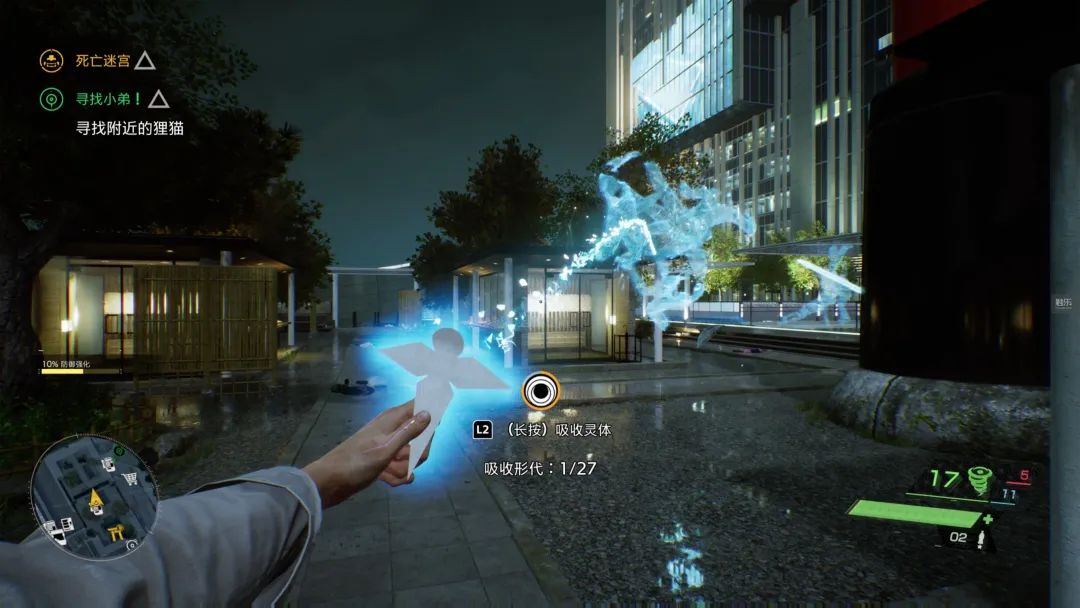 與此同時,動作遊戲中一些較為流行的設計在《幽靈線:東京》中也有體現,比如從背後悄悄接近敵人可以觸發背刺,能量槽攢滿後可以同時按下L3、R3發動終結技“絕對共鳴”,等等。