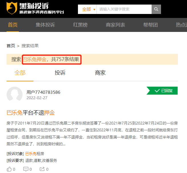 這些想法最終變為口號。巴樂兔向租客提供的電子合同儘管有諸多條款,但真正落地時卻寸步難行。在黑貓投訴網站關於巴樂兔的1767件投訴中,涉及“押金”字眼的投訴多達757件,多為房東不退押金,平台不處理問題。