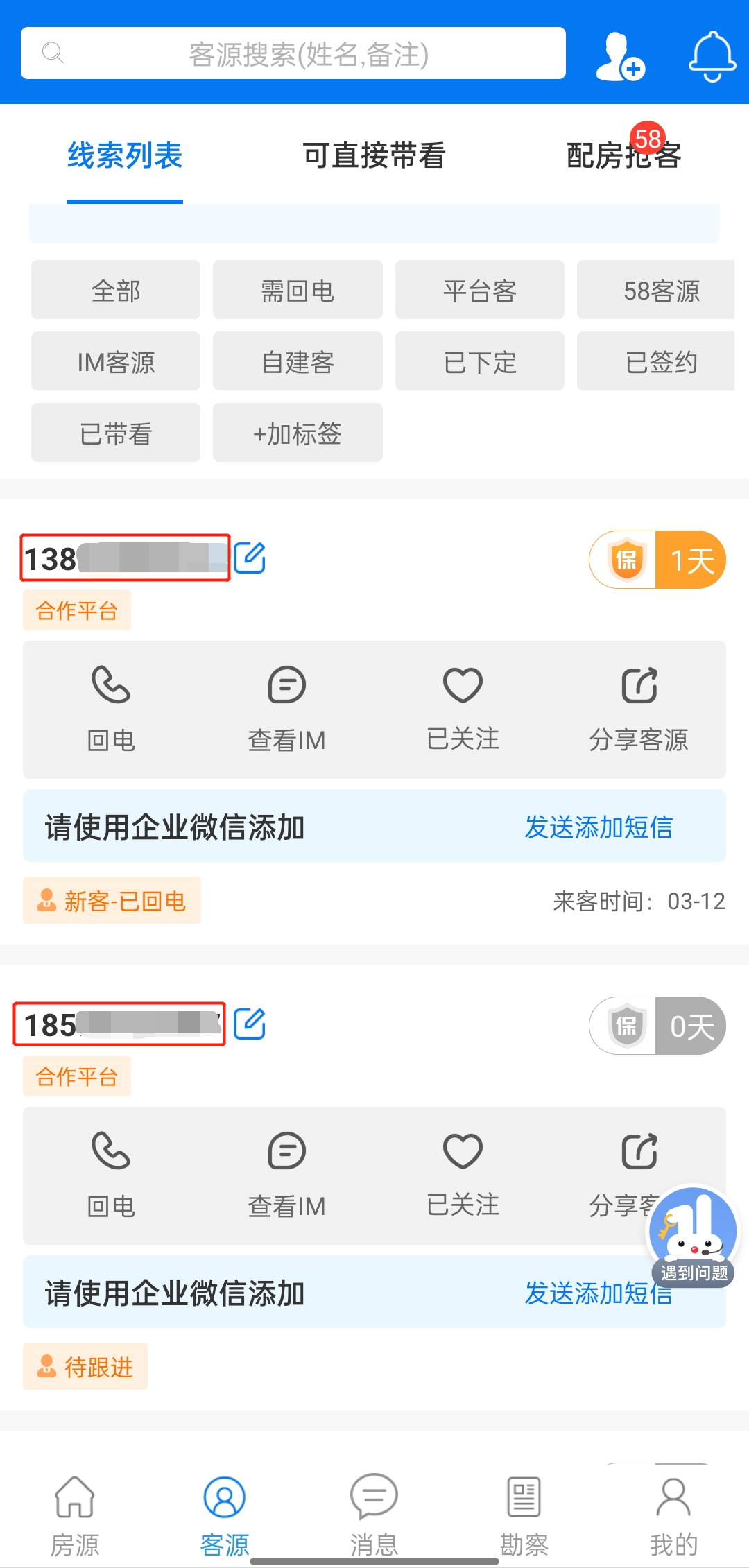 經過簡單培訓,記者下載了中介專用的“巴樂兔服務版”App,該App會將58同城等合作平台以及巴樂兔App上瀏覽房源的用户推送至“客源”頁面。