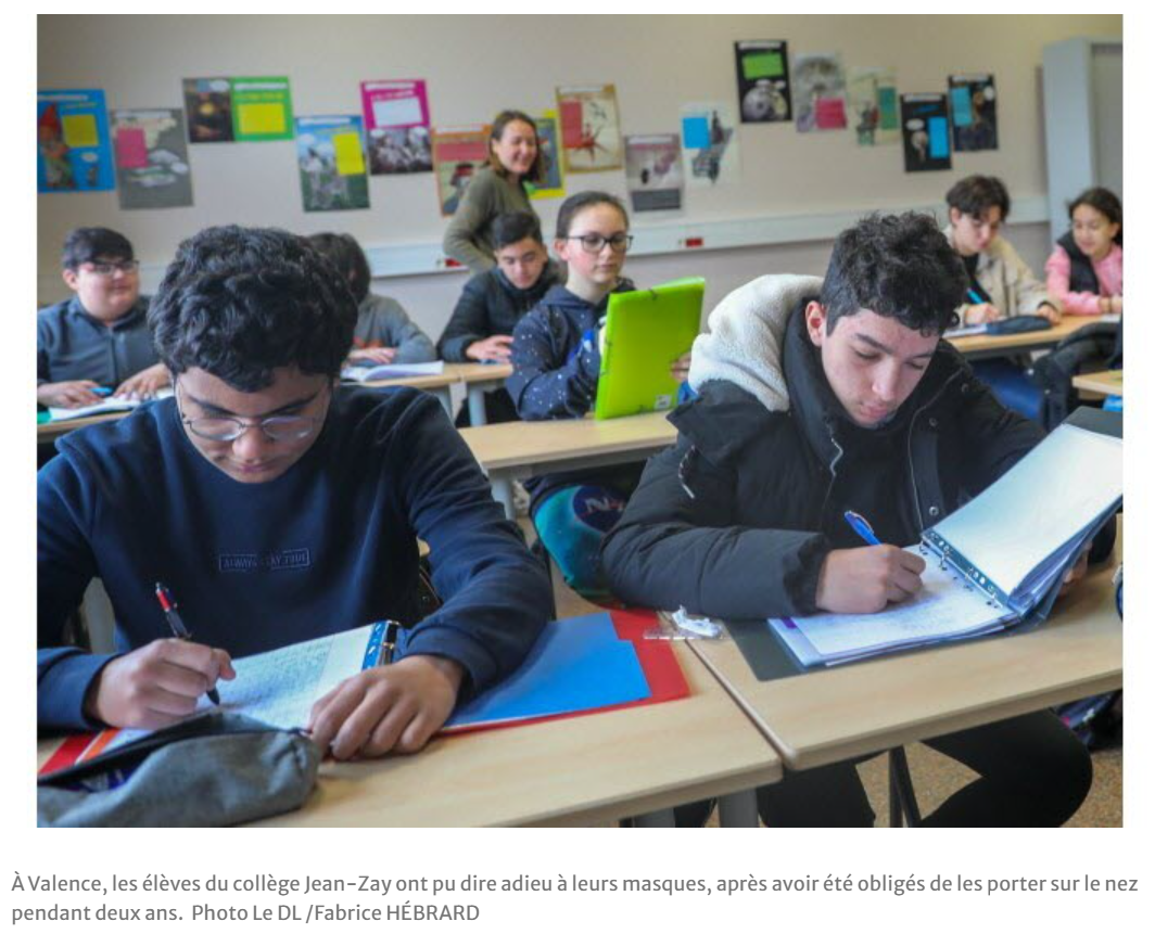▲ 時隔兩年,學生們終於可以不用戴口罩上課了。圖為14日在瓦朗斯一所中學內,學生們終於和口罩説再見了。