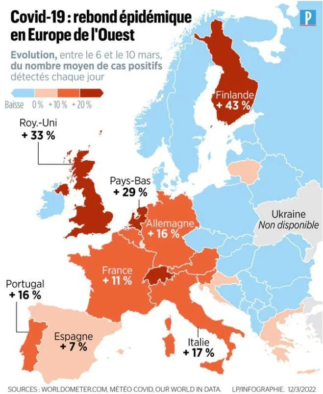 ▲ 3月6日至10日,西歐各國以及芬蘭疫情平均日增確診病例數均出現反彈。(《巴黎人報》圖)