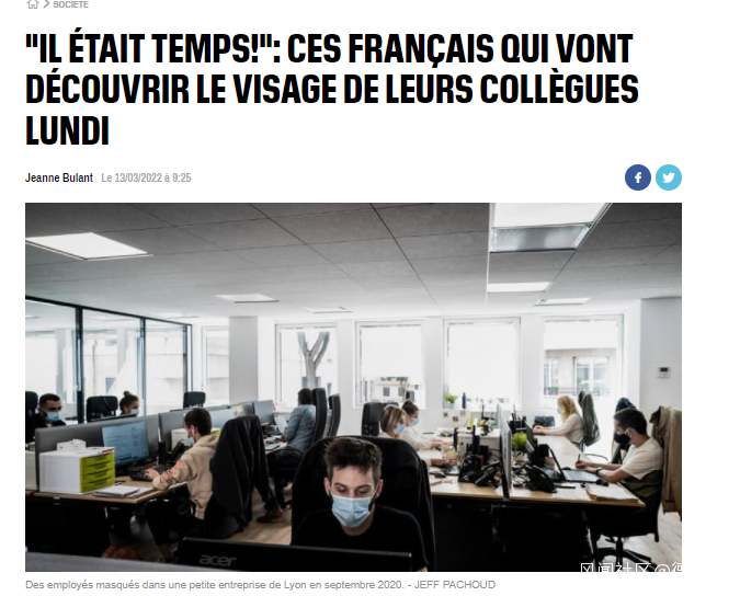 ▲ 14日起,企業內員工終於可以不用再戴口罩。一些法國員工興奮表示:“終於可以知道新同事到底長什麼樣了。”(法國BFMTV新聞台相關報道截圖)