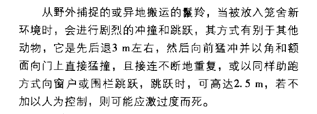 2012年,杭州動物園對在人工飼養下的鬣羚進行了行為觀察,發現鬣羚初入新的環境中時,有高度的敏感性,會產生強烈的應激行為,其中,猛烈地衝撞籠舍和不停地向上跳躍是其嚴重的應激行為之一。