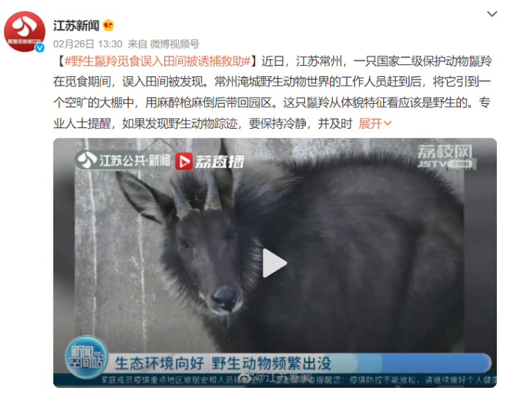 過去這種動物在江蘇已經非常稀少,因此罕有記錄。我們如果進行樂觀的推測,或許是近年來隨着生態保護意識的加強,鬣羚種羣開始恢復並且擴散,於是出現在了江蘇這種大家都覺得沒什麼大型野生動物的地方。