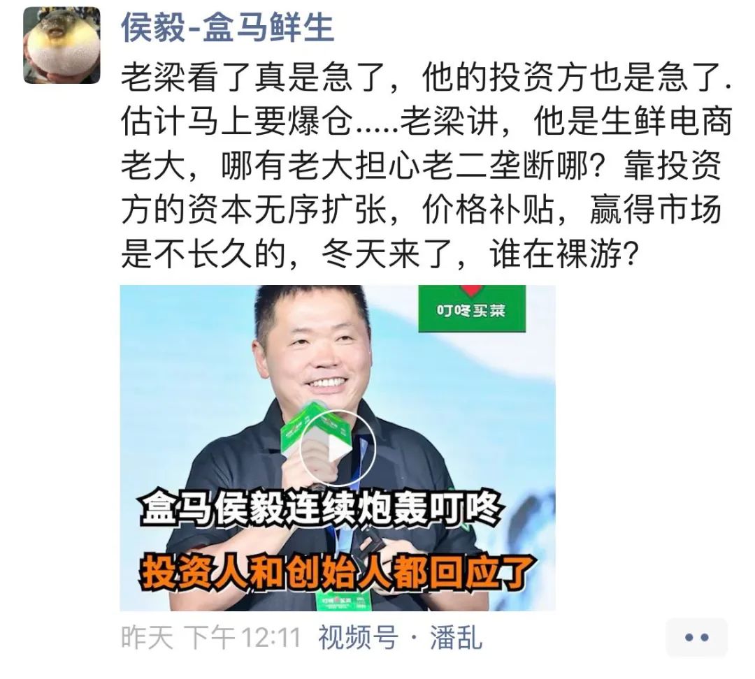 盒馬鮮生創始人侯毅隨後在朋友圈作了火藥味十足的回應。其稱,梁的表態説明叮咚買菜方面急了,投資方估計要爆倉。並回應了壟斷話題:“老梁講,他是生鮮電商老大,哪有老大擔心老二壟斷?靠投資方的無序擴張、價格補貼贏得市場是不長久的,冬天來了,誰在裸泳?”