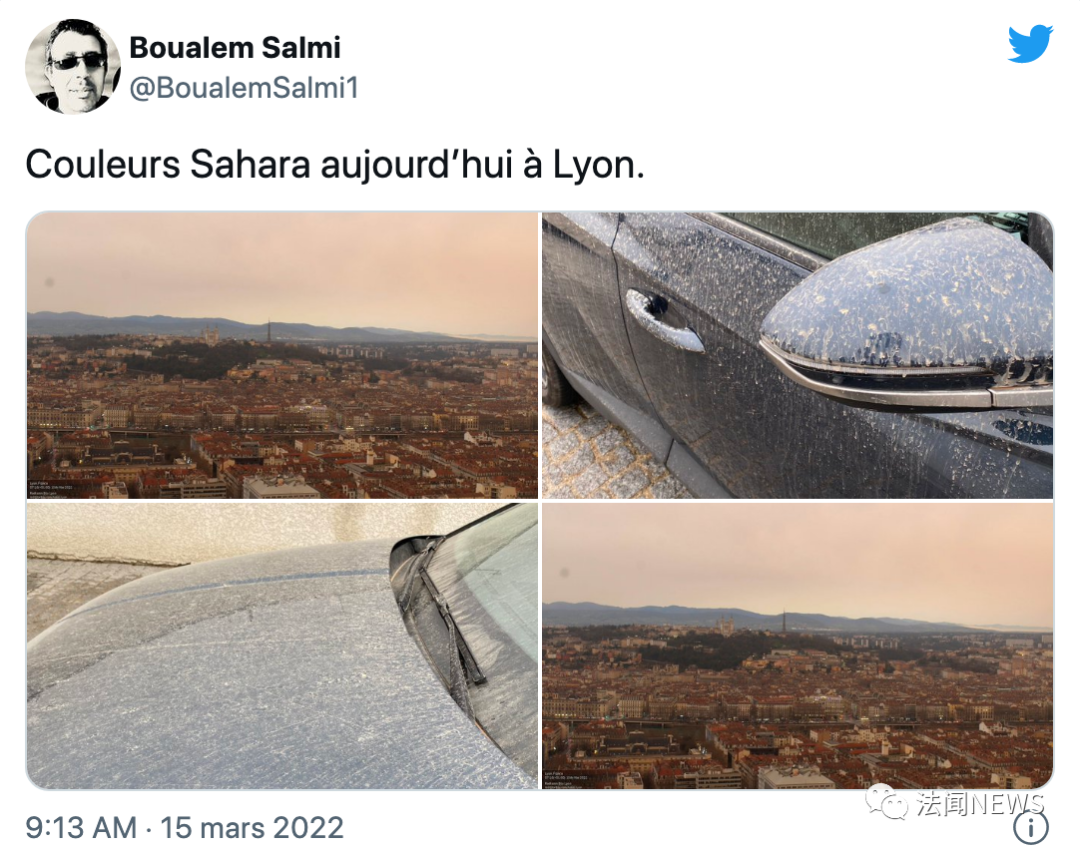 週二,法國許多地區都被橙色天空籠罩,不少人在網上發佈分享了這一現象,一些地方的降雨中含有大量的沙子。