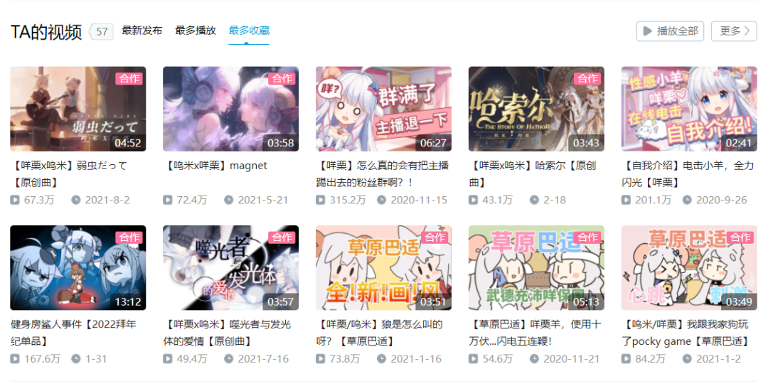 咩慄和嗚米的B站主頁都有着多個播放破百萬的投稿,但只要把這些投稿按收藏數排序,她們的第一首原創曲《弱蟲だって》便會來到首位,如今《哈索爾》也已經名列前茅——這或許就是原創曲對於虛擬偶像的意義所在。