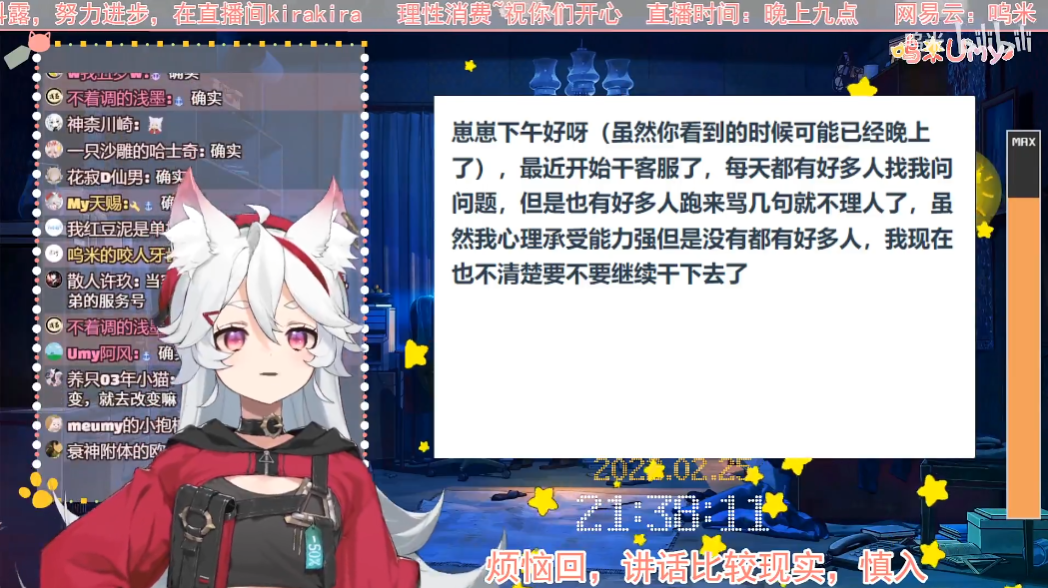 在一次以“煩惱相談”為主題的直播中,有觀眾留言説自己正從事客服行業,感覺自己的心理承受能力不太適合這一行。嗚米在寬慰完這位觀眾後,略帶自言自語地説道“那主播是不是也算一種客服啊?應該不算,主播相對客服還是稍微輕鬆一點。”