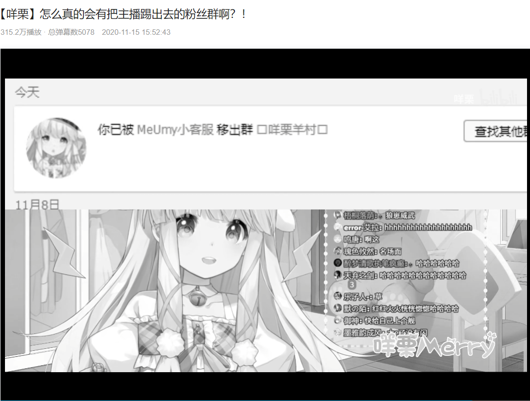 早期她們只會在B站上傳一些“切片”視頻——指的是把直播中有趣的片段剪輯出來,配上字幕和特效,以此來吸引更多觀眾。咩慄的主頁裏播放數最高的視頻就是一則切片,記錄了她在直播中被踢出自己的粉絲羣。