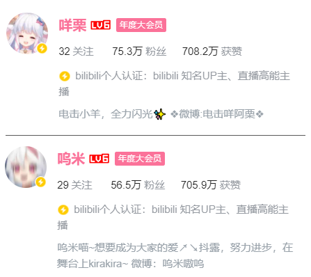 在B站的個人簡介裏,咩慄和嗚米分別將“全力閃光”與“在舞台上KIRAKIRA”用作了自己的口號。