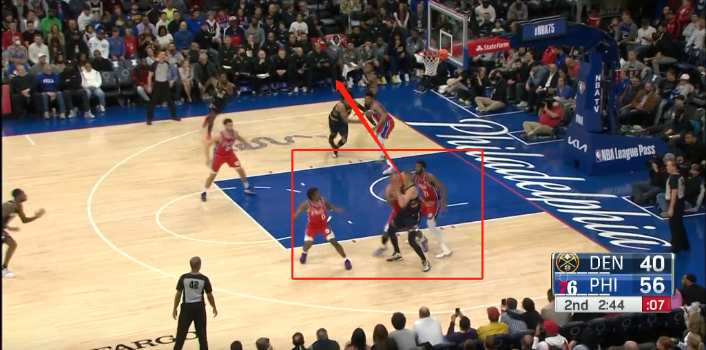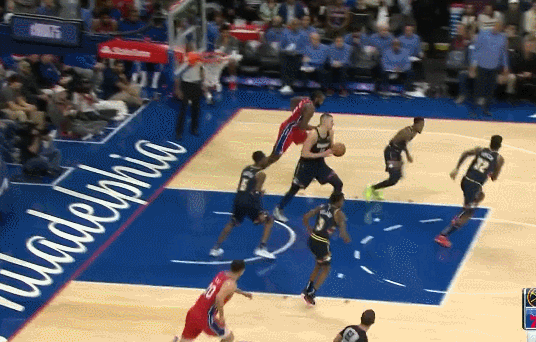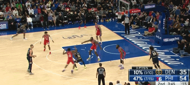 其實下半場雙方的防守都開始收縮了,就是賭對方的三分不準,費城前三節三分很準——大帝3中3,所以能壓住掘金。