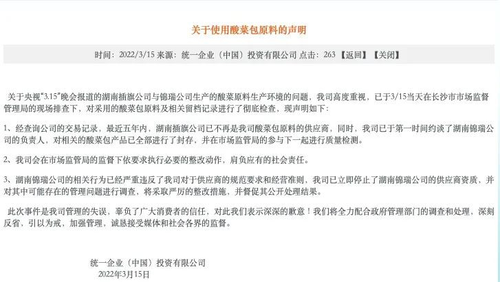今晚,統一就“土坑酸菜”問題發佈聲明稱,最近五年內,湖南插旗公司已不再是統一原材料供應商;同時,統一也第一時間約談了湖南錦瑞公司的負責人,對相關酸菜包產品封存、並將在市監局的參與下進行質量檢測。