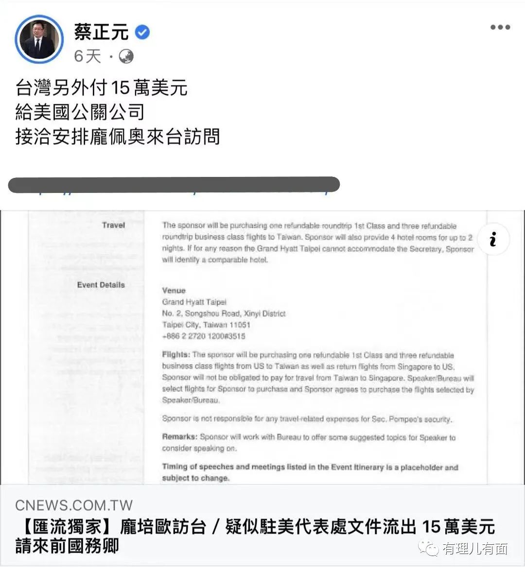 第二場,蓬佩奧被爆收取高額出場費,才願意為民進黨站台。據台媒報道,蓬佩奧此次來台出場費是15萬美元。但是,據藍黨“立委”蔡正元爆料,這個15萬美元僅僅是民進黨付給安排蓬佩奧來台訪問公司的“中介費”。實際上,蓬佩奧來台一場演講50萬美元,拜訪計場收費50萬美元,還要求民進黨投資指定公司20億元新台幣(約7042萬美元),完全把民進黨當作冤大頭。