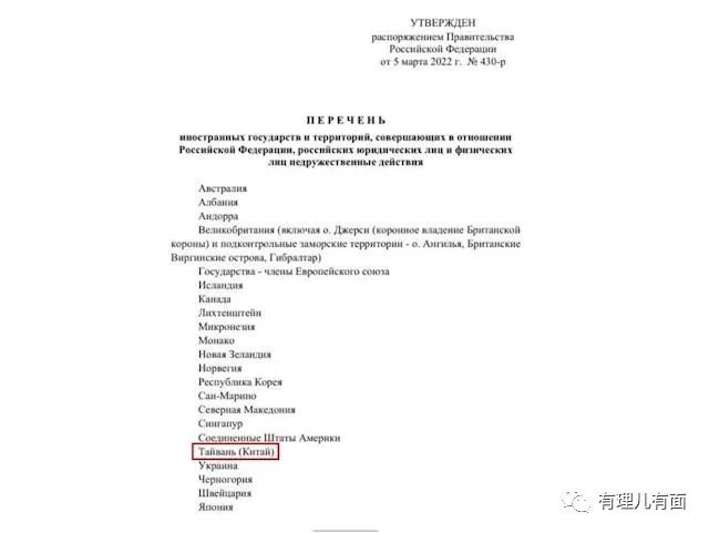 3月7日,俄羅斯政府公佈了一份對俄羅斯聯邦、俄羅斯法人實體和公民不友好的國家和地區名單,名單中列有台灣(中國)。