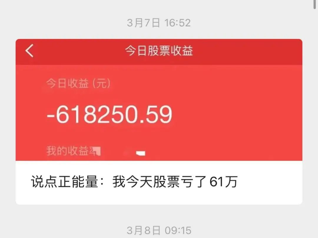 我今天算了算,如果股票基金一起算的話,過年後到現在我一共虧了600多萬。