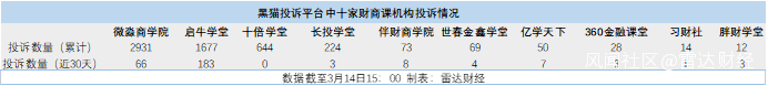 今年315,雷達財經在黑貓投訴平台中搜索發現了十家至少出現數十次投訴的財商機構,而網友們的投訴焦點則集中在虛假宣傳、退費難、客服/助教/老師服務態度差等。
